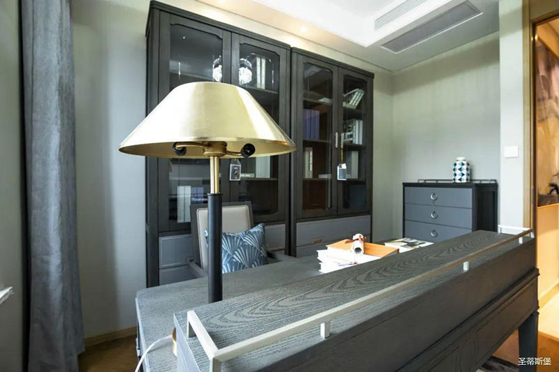 次臥高床屏由金屬鑲嵌,呈現簡約有序的線條,霧霾藍床屏與淺藍朦朧裝飾畫,窗簾相呼應,色澤搭配和諧自然,無不透漏著一種簡潔大方視覺體驗。