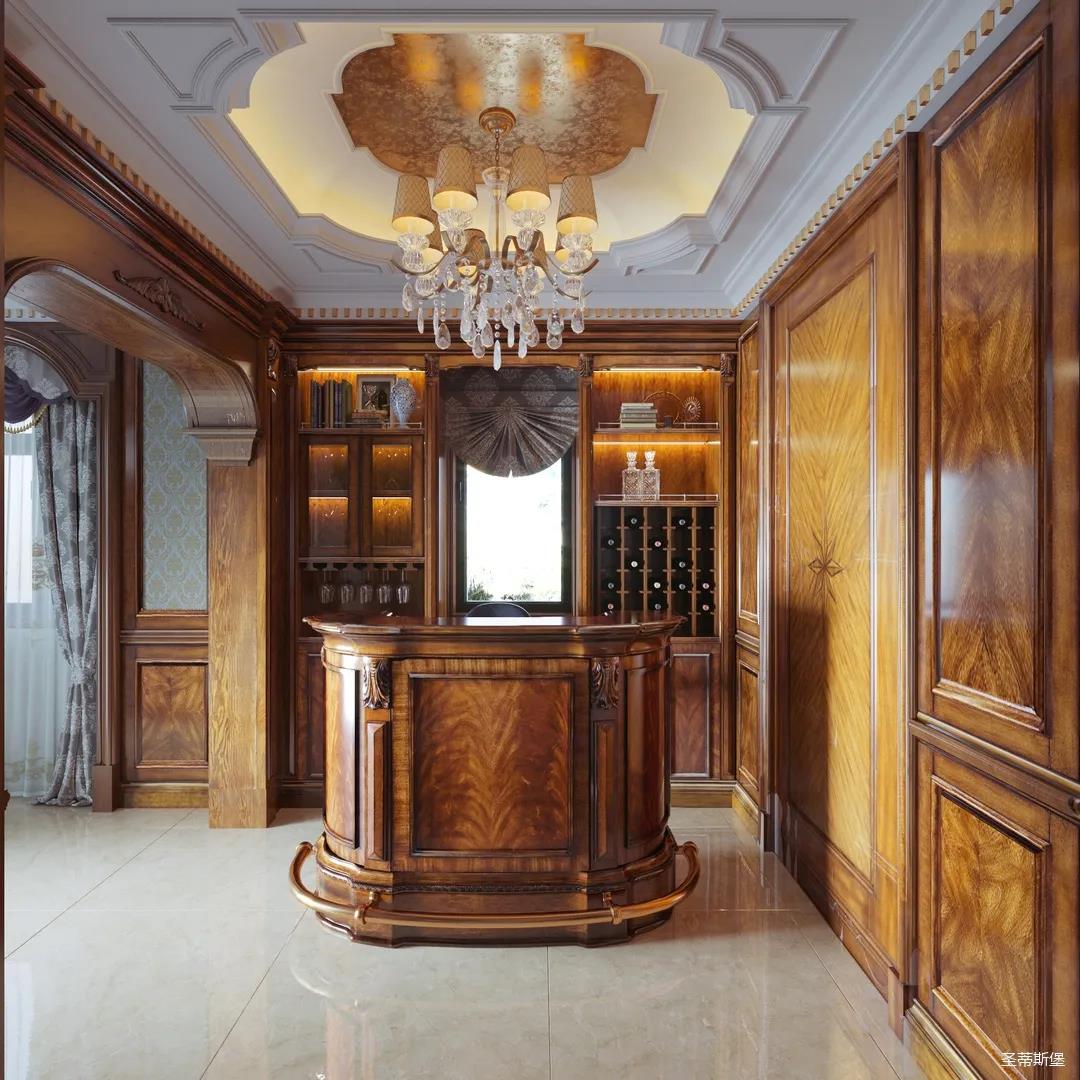進入玄關,即刻被吸引,懷舊的啞光漆面上點綴著古典的輪廓線與精致的雕花,仿佛進入了一座古老的森林城堡,神秘悠遠。隨處可見的黃銅元素,不僅給室內帶來了奢華質感,也彰顯著主人好客氣質。