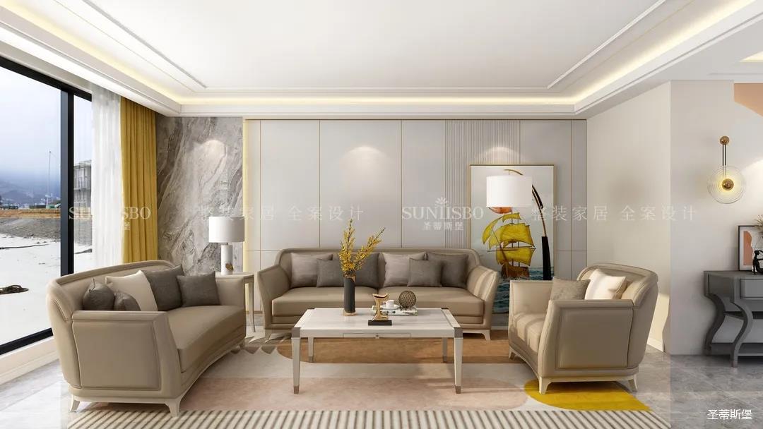 客廳設計置頂展示柜和大理石,實現了現代和輕奢風格間的均衡組合。溫柔莫蘭迪色調的沙發,細節的實木底座和人性化的環抱式設計讓空間更添溫馨的氣息。